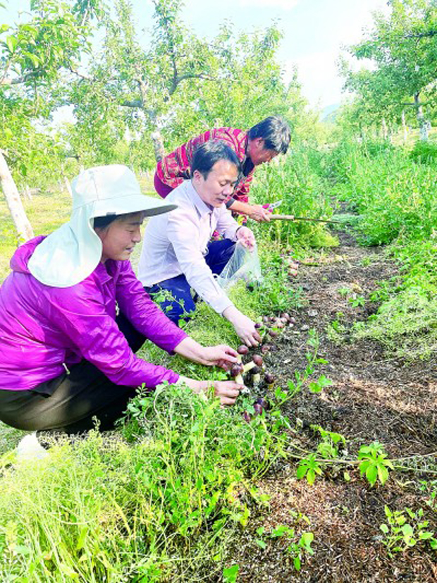 2019年,张国庆与当地农户不断沟通,终于说服几家农户参与试点。他们把农户剪下的废桃枝破碎、混合,将其铺入林地,再种上大球盖菇。